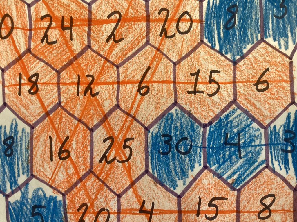 Sexhyrningaspil eða „3 í röð“ fann ég í stærðfræðibók og þurfti að prufukeyra og laga til. Spilið er mjög einfalt. Það eina sem þarf að hafa til taks eru tveir teningar og mismunandi litir, einn fyrir hvern þátttakanda. Æskilegur fjöldi þátttakenda er 2-4. Leikurinn gengur út á það að ná að lita sem flesta reiti í beinni röð. Keppendur skiptast á að kasta teningunum tveimur.